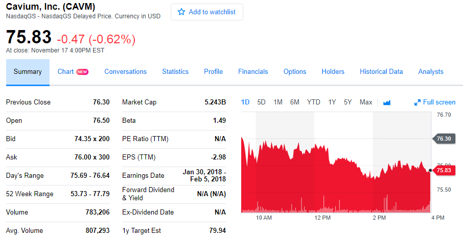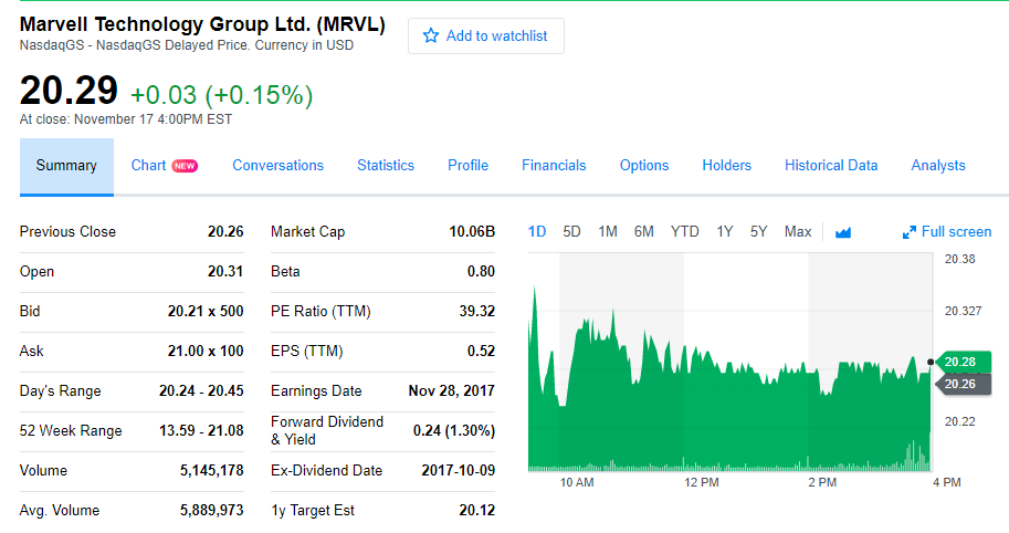 上周五,Marvell股價(jià)上揚(yáng)0.15%,報(bào)收20.29美元;Cavium報(bào)75.83美元,收跌0.62%。