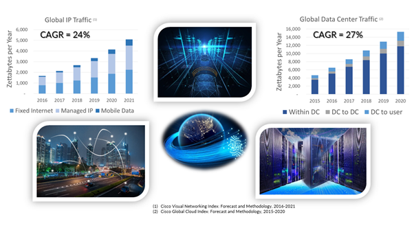 如圖1所示,思科最近的一項(xiàng)研究表明,全球IP和全球數(shù)據(jù)中心流量都在以25%左右的復(fù)合年增長(zhǎng)率增長(zhǎng)。新興應(yīng)用的激增,如互聯(lián)網(wǎng),視頻流,3D感應(yīng),智能汽車和VR / AR,已經(jīng)產(chǎn)生巨大的帶寬和新的數(shù)據(jù)中心的需求。到2020年,預(yù)測(cè)顯示50%的數(shù)據(jù)中心將具有超大規(guī)模水平,未來(lái)三年每年將建立約40個(gè)超大規(guī)模數(shù)據(jù)中心。