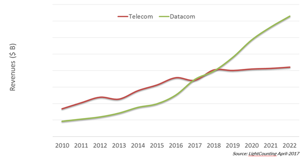 圖2 數(shù)據(jù)中心驅(qū)動(dòng)的數(shù)通光模塊的全球銷售收入超過(guò)了電信光模塊全球銷售收入。