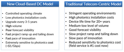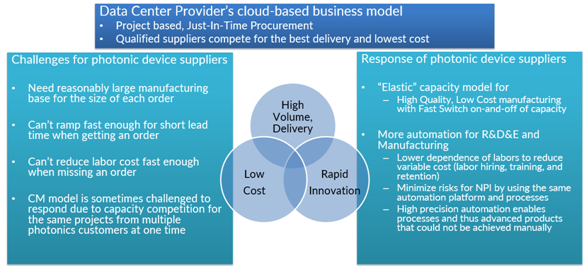 隨著數(shù)據(jù)中心需求成為新的增長(zhǎng)引擎,光電產(chǎn)業(yè)感受到了與傳統(tǒng)電信模型截然不同的新數(shù)據(jù)中心業(yè)務(wù)模式的挑戰(zhàn)。以下圖中總結(jié)了以電信為中心和以數(shù)據(jù)中心為中心的業(yè)務(wù)模型之間的主要差異。影響光電制造的最關(guān)鍵因素是大批量,低預(yù)測(cè)可見度,快速創(chuàng)新,產(chǎn)品快速響應(yīng)和低成本。