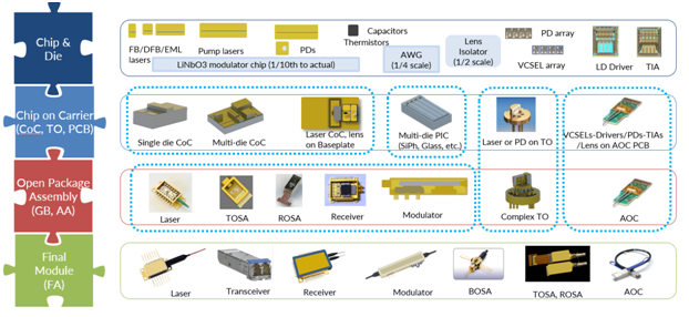 最后,針對(duì)數(shù)據(jù)中心應(yīng)用的產(chǎn)品快速更新?lián)Q代為大批量與高混合集成的光電制造帶來(lái)雙重挑戰(zhàn)。如圖3所示,在過(guò)去幾年中,光模塊已經(jīng)從10G升級(jí)到40G?,F(xiàn)在,100G正在超越40G成為新批量部署的領(lǐng)先技術(shù)。與此同時(shí),200G / 400G解決方案處于樣品設(shè)計(jì)和小批量生產(chǎn)階段。在相同的光電器件生產(chǎn)制造平臺(tái)上,所有這些不同的技術(shù)和產(chǎn)品將在一段時(shí)間內(nèi)共存。