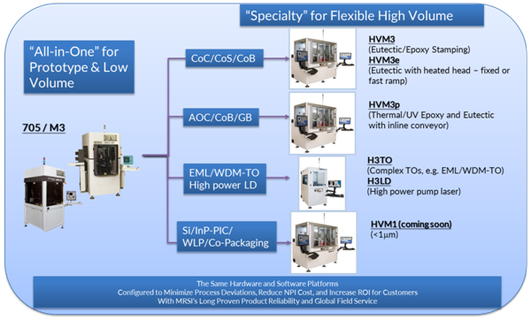 圖6是如何實(shí)現(xiàn)高效率的自動(dòng)貼片設(shè)備和工藝示例。該圖表中有三列 - 左邊是“一體化”類型的用于研發(fā)和低到中等體積的芯片粘合劑。中間是與圖5中示例一致的過(guò)程。右側(cè)是用于HVM的“特殊”類型的靈活高速貼片機(jī)的示例。通過(guò)以下我們列出的3個(gè)關(guān)鍵要點(diǎn),您可以理解此方法如何有助于光電產(chǎn)業(yè)應(yīng)對(duì)前面所討論的光電制造挑戰(zhàn):