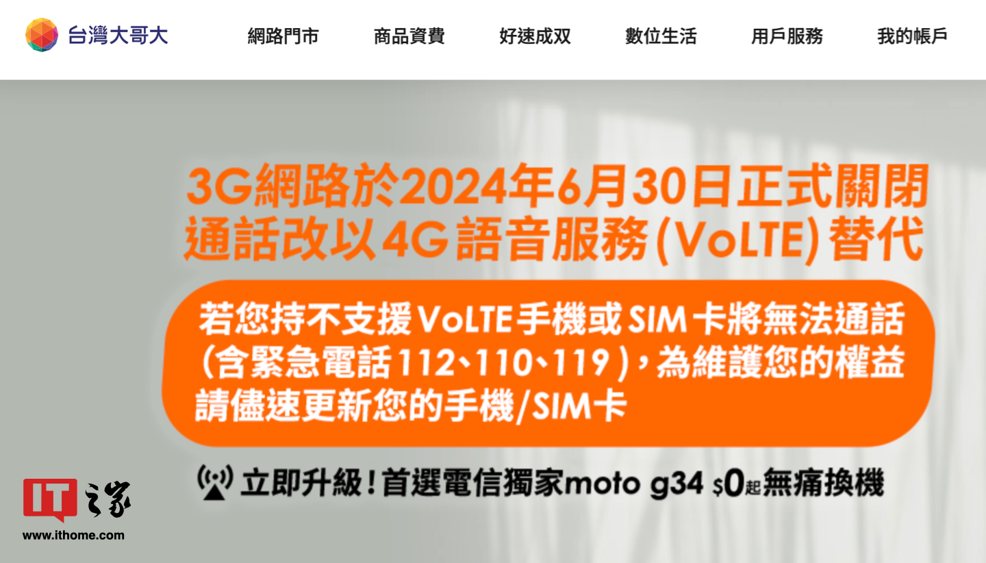 ICC訊 6 月 30 日消息,據(jù)中國臺灣地區(qū)三大運營商(“中華電信”、“遠傳電信”、“臺灣大哥大”)官網(wǎng),相關(guān)運營商將在明日關(guān)停 3G 網(wǎng)絡(luò),屆時不支持 VoLTE 的手機將無法在臺灣地區(qū)進行通話。
