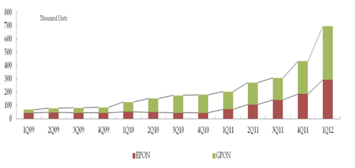 整體而言,觀察臺(tái)灣PON設(shè)備在2012年的出貨前景,受到中國(guó)市場(chǎng)支撐,全球的PON終端裝置市場(chǎng)在2012年至少維持兩千五百萬(wàn)臺(tái)的水準(zhǔn),而包括華為、中興、烽火將持續(xù)受益于內(nèi)需市場(chǎng)而維系EPON/GPON出貨動(dòng)能,其中GPON的出貨比重將持續(xù)提升,借此,已取得中國(guó)三大光通訊系統(tǒng)廠OEM代工訂單的臺(tái)廠其EPON/GPON的出貨將同步反應(yīng)與調(diào)整,惟平均售價(jià)仍持續(xù)會(huì)下修;阿爾卡特朗訊(Alcatel-Lucent)與愛(ài)立信(Ericsson)也在中國(guó)取得一定出貨占比,但交付臺(tái)廠的訂單因代工策略的調(diào)整而挹注相對(duì)有限;其他市場(chǎng)方面,臺(tái)廠已掌握部分俄羅斯與歐洲電信商的GPON,以及日本的EPON訂單,盡管相較中國(guó)大陸規(guī)模不成比例但對(duì)臺(tái)廠仍有不錯(cuò)的營(yíng)收貢獻(xiàn)與毛利。