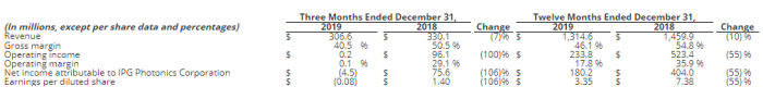 ICCSZ訊(編譯:Nina)美國馬薩諸塞州Oxford,2019年2月13日--IPG Photonics公司(納斯達(dá)克:IPGP)今天公布其截至2019年12月31日的第四季度和全年財(cái)務(wù)業(yè)績。