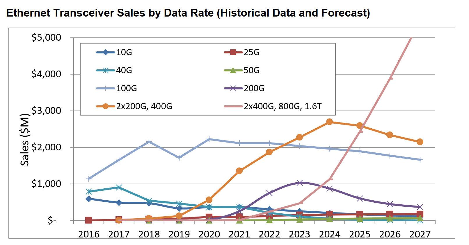 (從Lightcounting市場(chǎng)預(yù)測(cè)來(lái)看, 800G光模塊發(fā)貨量從2023年開(kāi)始急速增長(zhǎng),其銷(xiāo)售金額將于2025年超過(guò)當(dāng)前主流的400G光模塊,位居以太網(wǎng)主流速率首位)