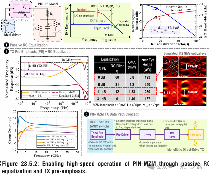 下圖總結(jié)提升方法,將 PIN 相位調(diào)制器與無(wú)源RC 高通濾波器級(jí)聯(lián),可降低低頻分量影響,通過(guò)適當(dāng)選擇 RC,可獲得平坦的電光響應(yīng)和更高的帶寬,該方法可參考之前分享。