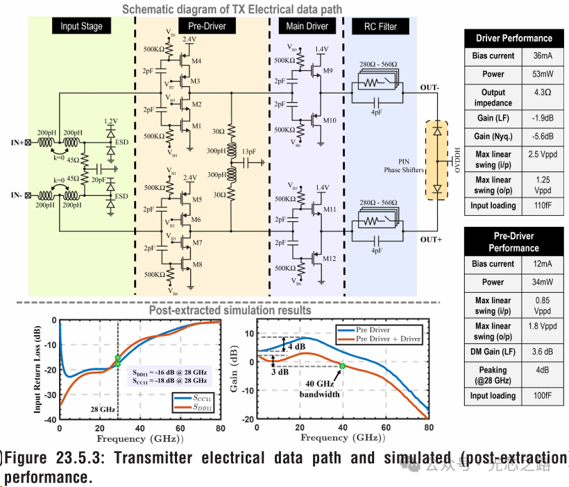 為了補(bǔ)償驅(qū)動(dòng)器的非單位增益(-1.9dB)以及 MZM 與高頻損耗相關(guān)的高頻率損失(-3.7dB),使用一個(gè)前置驅(qū)動(dòng)級(jí)。由CML 拓?fù)浣Y(jié)構(gòu)實(shí)現(xiàn)的前置驅(qū)動(dòng)器與主驅(qū)動(dòng)器進(jìn)行交流耦合,利用更高的電源電壓和共源共柵器件來(lái)實(shí)現(xiàn)高輸出線性度。