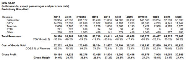 ICC訊(編譯:Nina)美國(guó)德州Sugar Land,2020年11月5日--Applied Optoelectronics公司(簡(jiǎn)稱AOI)(納斯達(dá)克:AAOI),一家為互聯(lián)網(wǎng)數(shù)據(jù)中心、Cable寬帶、電信和FTTH市場(chǎng)提供光學(xué)接入網(wǎng)絡(luò)產(chǎn)品的領(lǐng)先供應(yīng)商,今天公布了其截至2020年9月30日的第三季度財(cái)報(bào)。