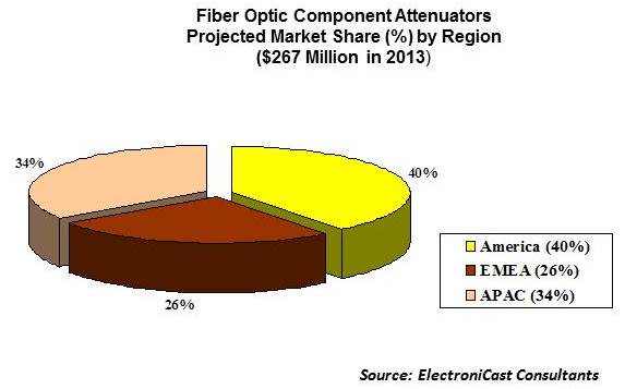 ICCSZ訊 據(jù)ElectroniCast預(yù)測(cè),2013年全球組件級(jí)光纖衰減器市場(chǎng)達(dá)到2.67億美元。在預(yù)測(cè)期內(nèi),預(yù)計(jì)該市場(chǎng)年均增長(zhǎng)率為6.8%,到2018年將達(dá)到3.7億美元。