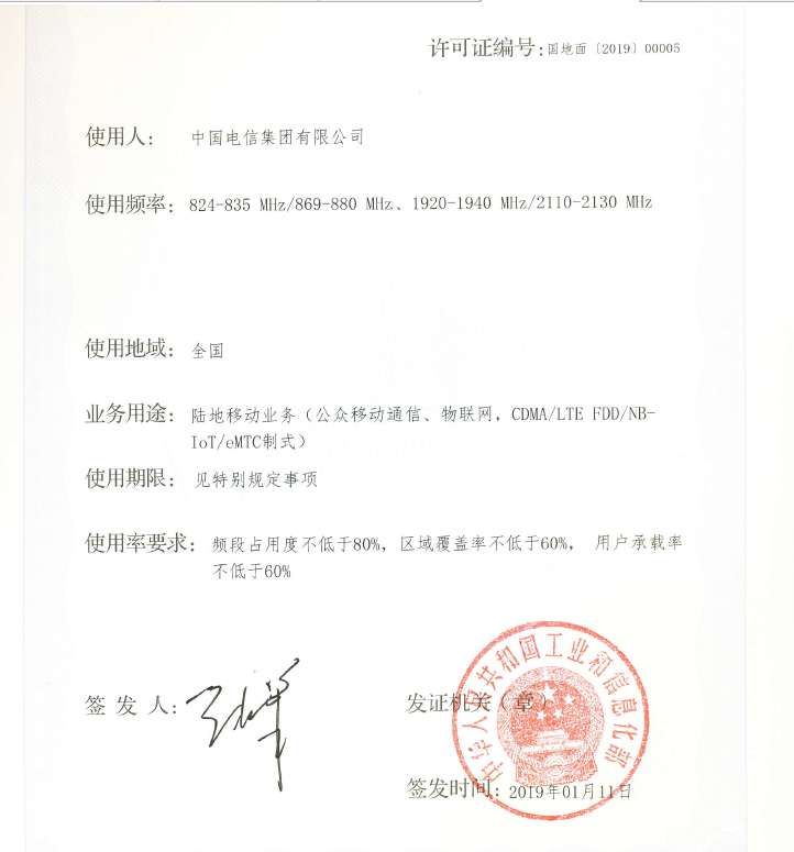 也就是說,一開年,中國電信收到了來自工信部的“大紅包”,允許其在全國使用使用824-835 MHz/869-880 MHz、1920-1940 MHz/2110-2130 MHz,這些頻率被用于陸地移動業(yè)務(公眾移動通信、物聯(lián)網(wǎng)、CDMA/LTE FDD/NB-IoT/eMTC制式)。在文件上,工信部還對使用率做出了要求,要求頻段占用度不低于80%,區(qū)域覆蓋率不低于60%,用戶承載率不低于60%。