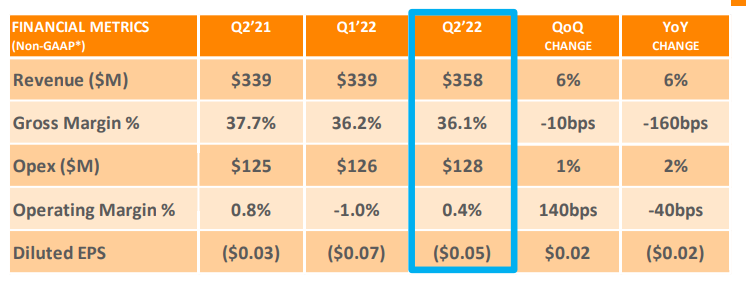 2022年第二季度,Infinera GAAP銷售收入3.58億美元,上個季度3.39億美元,去年同期3.38億美元。GAAP毛利率30.5%,上個季度32.9%,去年同期35.6%。GAAP凈虧損5570萬美元,或每股虧損26美分;上個季度GAAP凈虧損4190萬美元,或每股虧損20美分;去年同期GAAP凈虧損3560萬美元,或每股虧損17美分。