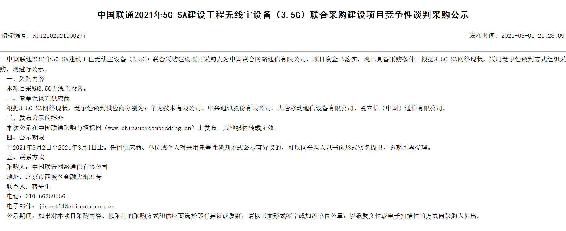 中國聯(lián)通也同時(shí)發(fā)布公告,中國聯(lián)通2021年5G SA建設(shè)工程無線主設(shè)備(3.5G)聯(lián)合采購建設(shè)項(xiàng)目擬采用競爭性談判方式組織采購。根據(jù)3.5G SA網(wǎng)絡(luò)現(xiàn)狀,競爭性談判供應(yīng)商分別為華為技術(shù)有限公司、中興通訊股份有限公司、大唐移動(dòng)通信設(shè)備有限公司、愛立信(中國)通信有限公司。
