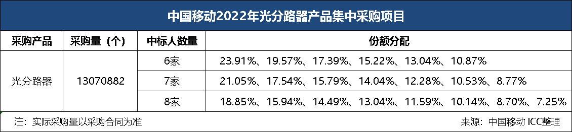 ICC訊 11月19日消息,中國移動(dòng)發(fā)布2022年光分路器產(chǎn)品集中采購項(xiàng)目,預(yù)估采購光分路器產(chǎn)品約1307.1萬個(gè),采購需求滿足期為1年,實(shí)際采購量以采購合同為準(zhǔn)。