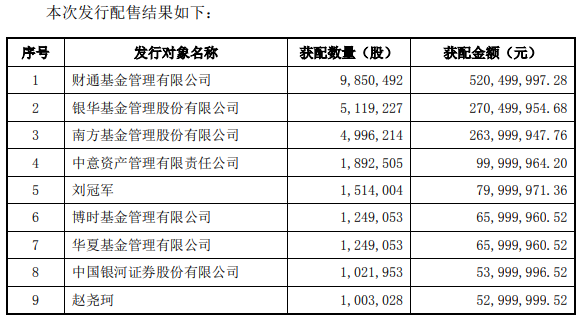 ICC訊 12月7日晚間,成都新易盛通信技術(shù)股份有限公司發(fā)布向特定對(duì)象發(fā)行股票并在創(chuàng)業(yè)板上市 發(fā)行情況報(bào)告書 ,本次向特定對(duì)象發(fā)行股票的數(shù)量為3122.63萬(wàn)股并在深圳證券交易所上市交易,全部采取向特定對(duì)象發(fā)行股票的方式發(fā)行。本次發(fā)行最終獲配發(fā)行對(duì)象共計(jì) 13 名,發(fā)行價(jià)格為 52.84 元/股,募集資金總額為 1,649,999,594.24 元。本次發(fā)行最終確定的發(fā)行對(duì)象及獲配股數(shù)、獲配數(shù)量、 獲配金額情況如下: