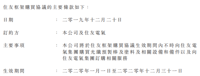 公告稱,成都普天電纜于二零一九年十二月二十日,訂立住友框架購(gòu)買協(xié)議,由二零二零年一月一日起為期一年,內(nèi)容有關(guān)成都普天電纜向住友電氣集團(tuán)購(gòu)買光纖預(yù)制棒及涂料及相關(guān)設(shè)備和備件以及訂購(gòu)相關(guān)技術(shù)服務(wù)。 由于住友電氣是成都普天電纜非全資附屬公司的主要股東,因此根據(jù)上市規(guī)則,住友電氣為成都普天電纜附屬公司層面的關(guān)連人士。