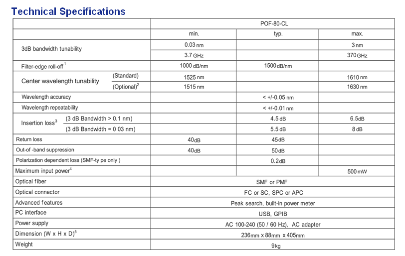 The above specifications are guaranteed at ambient temperature of 25 +/- 1 ℃. In the case of POF-80-CL, allow sufficient warm-up time for stable operation. The above specifications may change without prior notice.