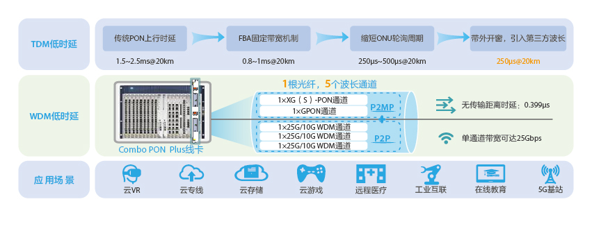 Combo PON Plus解決方案通過獨立波長疊加機制,在PON網(wǎng)絡(luò)中引入WDM技術(shù),提供確定極致低時延。創(chuàng)新的Combo PON Plus線卡一個端口含5個波長通道,其中2個波長通道分別用于GPON和10G PON,提供兩種速率的FTTx固定接入,ONU終端按需靈活部署,實現(xiàn)GPON向10G PON的平滑升級。另外3個通道分別用于1個10G/25G WDM波長,提供10/25Gbps帶寬,無傳輸距離下的端到端時延低至0.399μs,相對20km光纖傳輸時延100μs可忽略不計,滿足光接入網(wǎng)在云專線、5G基站接入、工業(yè)互聯(lián)等場景的應(yīng)用要求。