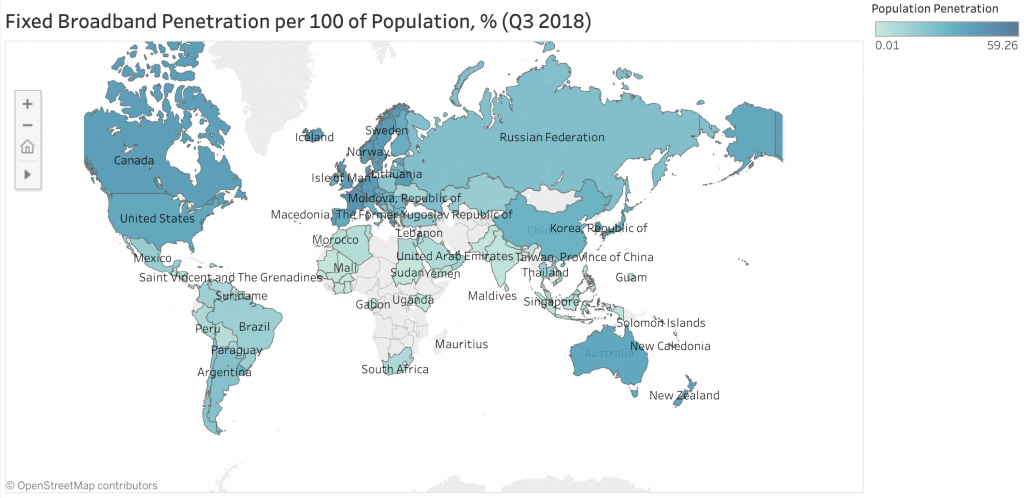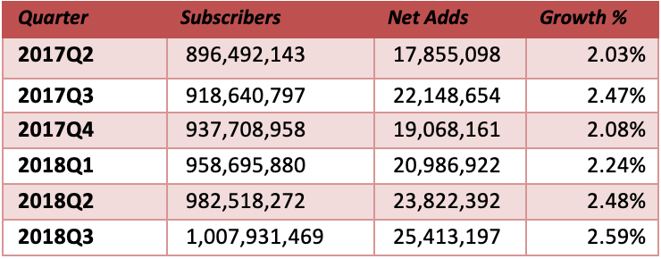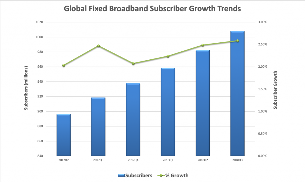 ICCSZ訊(編譯:Vicki)Point topic公布了截止至2018年第三季度的全球寬帶市場請況。在2018年第三季度末,固定寬帶用戶的季度增長比上一季度增長了2.6%。全球固定寬帶連接數(shù)量超過10億里程碑,達(dá)到10.08億。