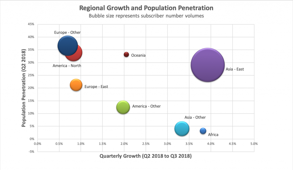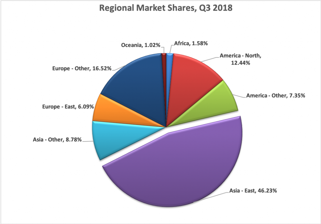 固定寬帶用戶中所有凈增加的近70%來自東亞(圖3),這也使所有用戶中最大的區(qū)域市場份額保持在46%(圖4)。 與2018年第二季度相比,這仍然大致相同。西歐的市場份額從2018年第二季度的17%略微下降至2018年第三季度的16%,而其他地區(qū)的市場份額幾乎完全沒有變化。