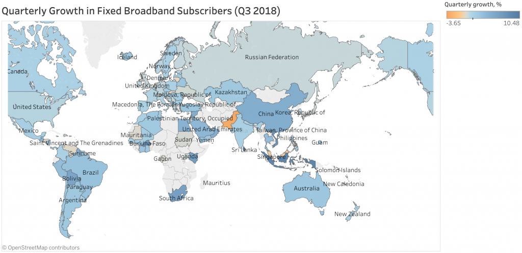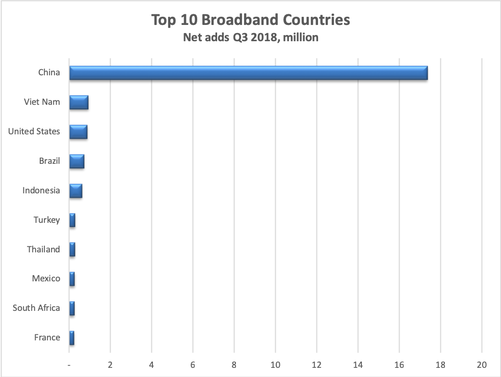 這一增長在過去六個季度中最高,主要是由于東亞的增長提供了近70%的固定寬帶用戶的凈增加。