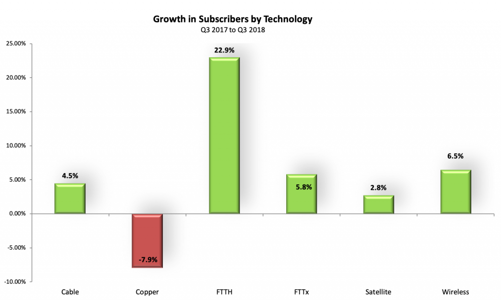 就年度變化而言,2017年第三季度至2018年第三季度全球copper數(shù)量下降了8%,而FTTH連接數(shù)量增加了23%,F(xiàn)TTx增長了6%(圖9)。