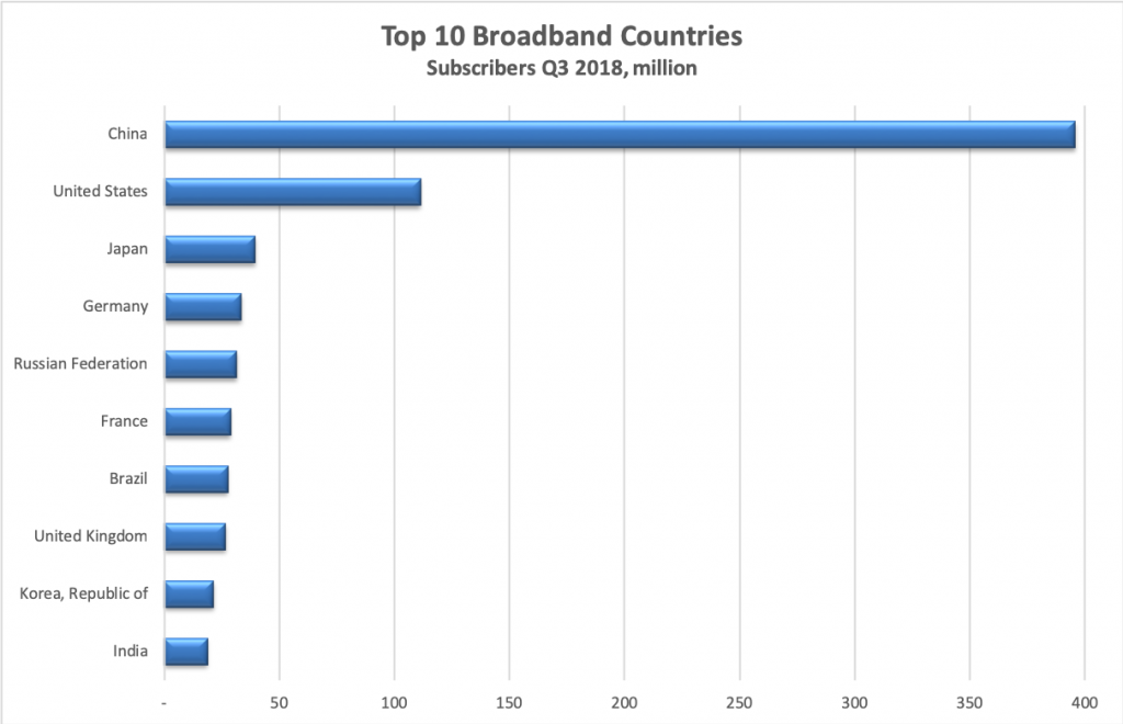 中國仍然是最大的光纖增長市場。截至2018年第三季度末的12個月中,中國的FTTH連接增長了25%。這一數(shù)字占該期間全球FTTH凈增加量的82%。