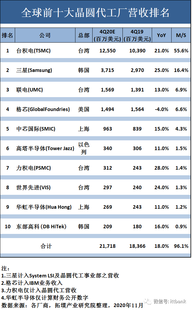 2020年第四季度全球前十大晶圓代工廠營收預(yù)測排名