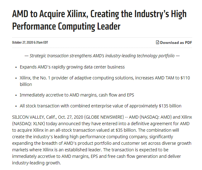ICC訊 10月27日,AMD正式宣布,公司與FPGA芯片龍頭賽靈思已達(dá)成一項(xiàng)最終協(xié)議,同意AMD發(fā)行總價(jià)值350億美元股票的方式收購(gòu)賽靈思。
