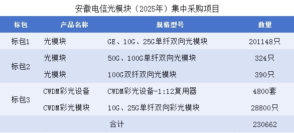 根據(jù)此前招標(biāo)公告信息,此次集采光模塊23萬只,包括CWDM彩光4800套。劃分3個標(biāo)包??傤A(yù)算金額:4365萬元人民幣(含稅),其中標(biāo)包1:3557萬元人民幣(含稅),標(biāo)包2:201萬元(含稅),標(biāo)包3:607萬元人民幣(含稅)。此次招標(biāo)合同有效期2年。具體標(biāo)包劃分如下: