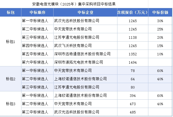 ICC訊 2025年6月10日中國電信采購網(wǎng)發(fā)布《安徽電信光模塊(2025年)集中采購項目中標(biāo)候選人公示》。