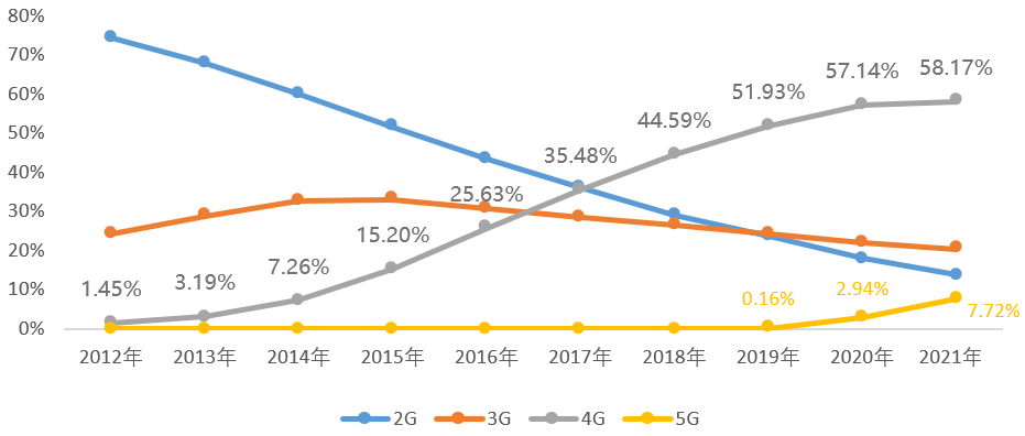 圖:全球2G、3G、4G、5G用戶滲透率的變化情況