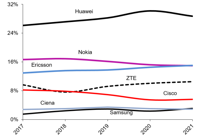 全球通信設備供應商市場競爭格局保持基本穩(wěn)定,華為、諾基亞、愛立信位居市場排名前三,占據(jù)市場份額超過50%。盡管美國實施了貿(mào)易限制,但華為仍占據(jù)全球第一大通信設備商地位,2021年占全球通信設備市場28.7%的份額,同比增長7%。華為雖然在除中國之外全球其他國家通信設備市場營收下滑,但憑借著龐大的國內(nèi)市場規(guī)模,其運營商業(yè)務穩(wěn)健發(fā)展,企業(yè)業(yè)務繼續(xù)增長。