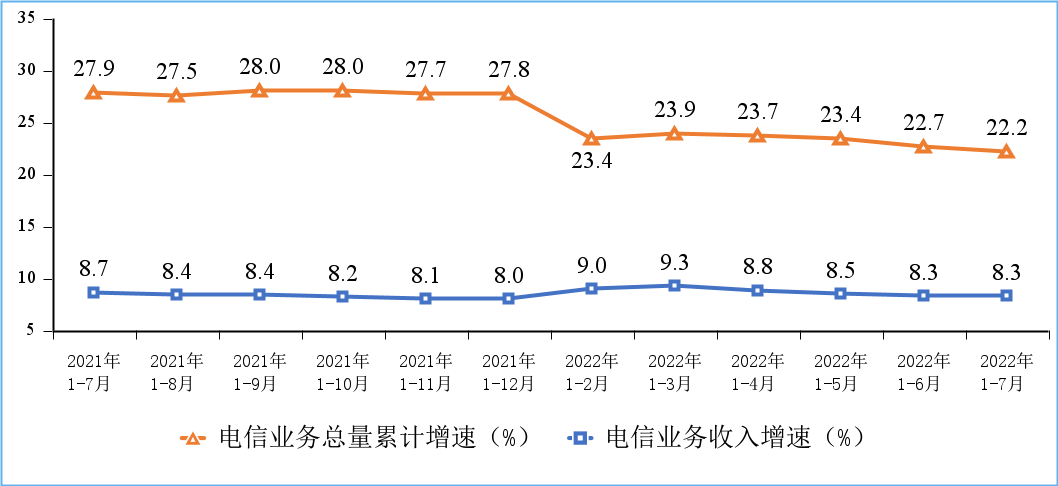 ICC訊 1-7月份,通信業(yè)保持良好運(yùn)行態(tài)勢(shì)。電信業(yè)務(wù)收入穩(wěn)步增長(zhǎng),電信業(yè)務(wù)總量保持較快增長(zhǎng);5G、千兆光網(wǎng)和物聯(lián)網(wǎng)等新型基礎(chǔ)設(shè)施建設(shè)和應(yīng)用快速推進(jìn),網(wǎng)絡(luò)運(yùn)力和感知能力持續(xù)增強(qiáng);云計(jì)算等新興業(yè)務(wù)拉動(dòng)作用明顯,行業(yè)發(fā)展新動(dòng)能持續(xù)釋放。