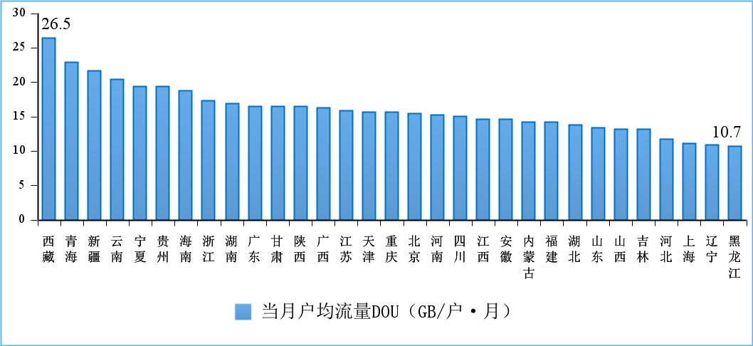 中部地區(qū)移動(dòng)互聯(lián)網(wǎng)接入流量增速領(lǐng)先,西部部分省份DOU值居全國(guó)前列。1-7月份,東、中、西部和東北地區(qū)移動(dòng)互聯(lián)網(wǎng)接入流量分別達(dá)到622.1億GB、330.6億GB、434.6億GB和75.5億GB,同比增長(zhǎng)19.1%、20.5%、19.4%和12.5%。西藏、青海、新疆和云南4省7月當(dāng)月戶均移動(dòng)互聯(lián)網(wǎng)接入流量(DOU)超過20GB/戶·月;各省DOU值最高值與最低值之差為15.8GB/戶·月,差值較去年同期擴(kuò)大2.4GB/戶·月。