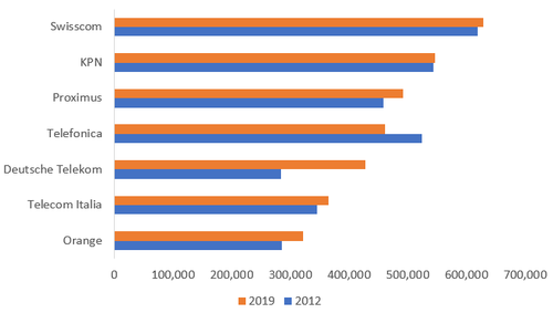 在2018年至2019年期間,所有運(yùn)營商都設(shè)法使每名員工的收入增加(比如意大利電信),該公司一直在將意大利的移動(dòng)客戶流失給積極進(jìn)取的法國公司Iliad,該公司于2018年5月推出了低成本的意大利服務(wù)。