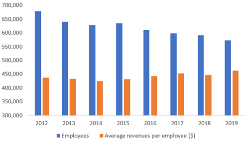 電信運(yùn)營商跑贏了歐洲同行。 AT&T去年的人均收入為73.1萬美元,而AT&T自2017年以來已裁減了約32,000個(gè)工作崗位。而Verizon(人均銷收入為97.7萬美元),其已