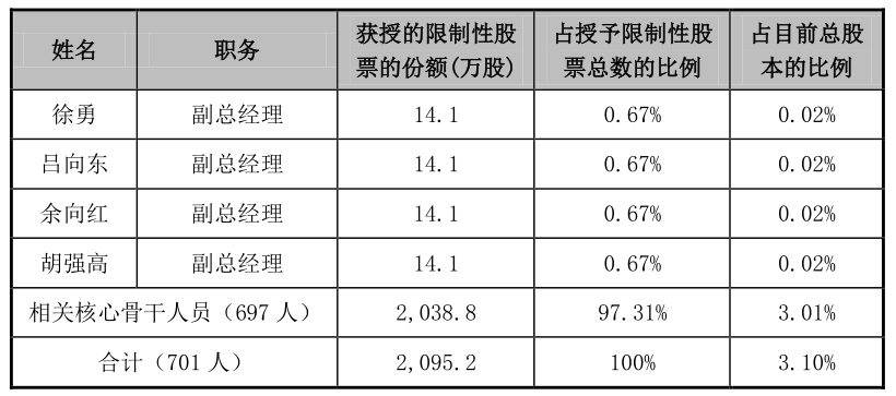 3、授予對(duì)象:公司核心管理、業(yè)務(wù)及技術(shù)骨干