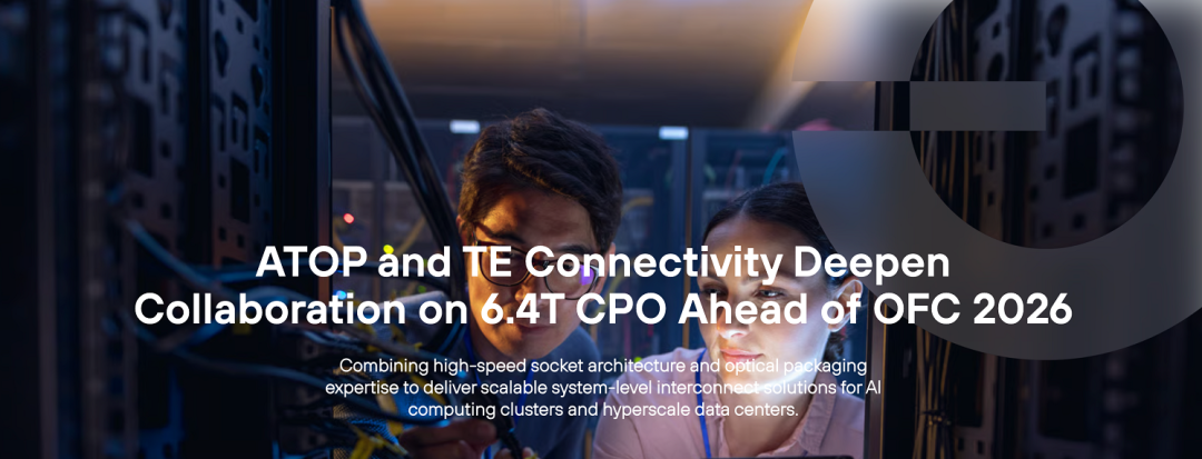 ICC訊 在OFC 2026期間,ATOP將正式展示其在下一代6.4T共封裝光學(xué)(CPO)領(lǐng)域的最新進(jìn)展,與全球連接器領(lǐng)導(dǎo)者 TE Connectivity(TE) 深化合作,圍繞6.4T CPO場景共同推進(jìn)關(guān)鍵技術(shù)整合。