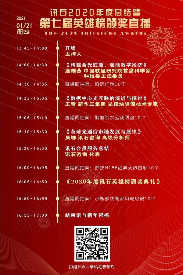 ICC訊 1月21日,訊石將開啟2021新年第一場線上直播活動(dòng)——“訊石2020年度總結(jié)暨第七屆英雄榜頒獎(jiǎng)直播”,邀請光通信業(yè)內(nèi)知名專家分析未來光通信市場發(fā)展,由訊石總結(jié)2020年光通信發(fā)展?fàn)顩r,線上直播同期將舉辦第七屆訊石英雄榜頒獎(jiǎng)典禮,發(fā)布2020年度最具競爭力產(chǎn)品,歡迎及誠邀廣大業(yè)界朋友預(yù)約觀看!