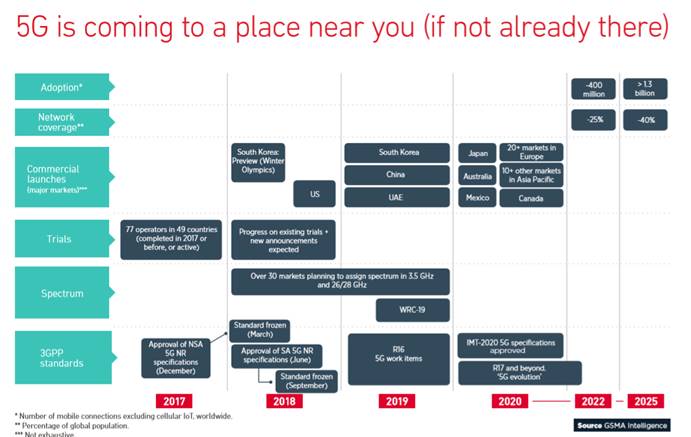 2019年韓國(guó)、中國(guó)、阿拉伯聯(lián)合酋長(zhǎng)國(guó)將會(huì)推出商用5G網(wǎng)絡(luò),2020年,日本、澳大利亞、墨西哥、歐洲20多個(gè)國(guó)家、亞太10多個(gè)國(guó)家、加拿大也會(huì)商用。