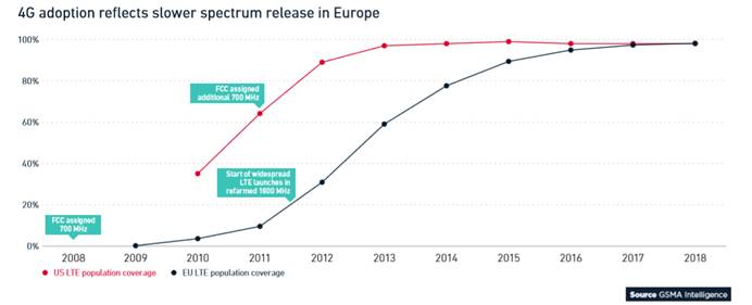 從圖表可以看到,2013年時(shí),美國(guó)4G普及率接近97%,而歐洲只有60%,因?yàn)槠占八俣嚷?,意味著歐洲分配頻譜的速度會(huì)慢一些。