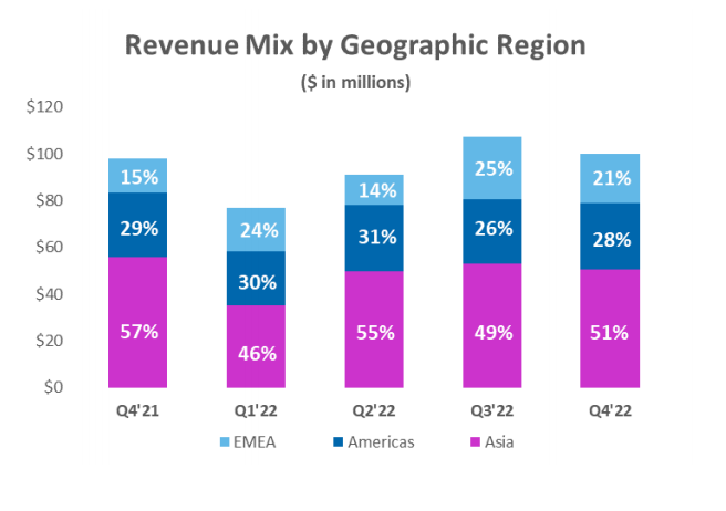 按區(qū)域劃分, 2022年第四季度DZS在美洲地區(qū)的收入,同比增長3%,達(dá)到2840萬美元。歐洲、中東和非洲地區(qū)的收入同比增長44%,至 2100萬美元。亞洲地區(qū)的收入同比下滑9%,達(dá)到 5080萬美元。