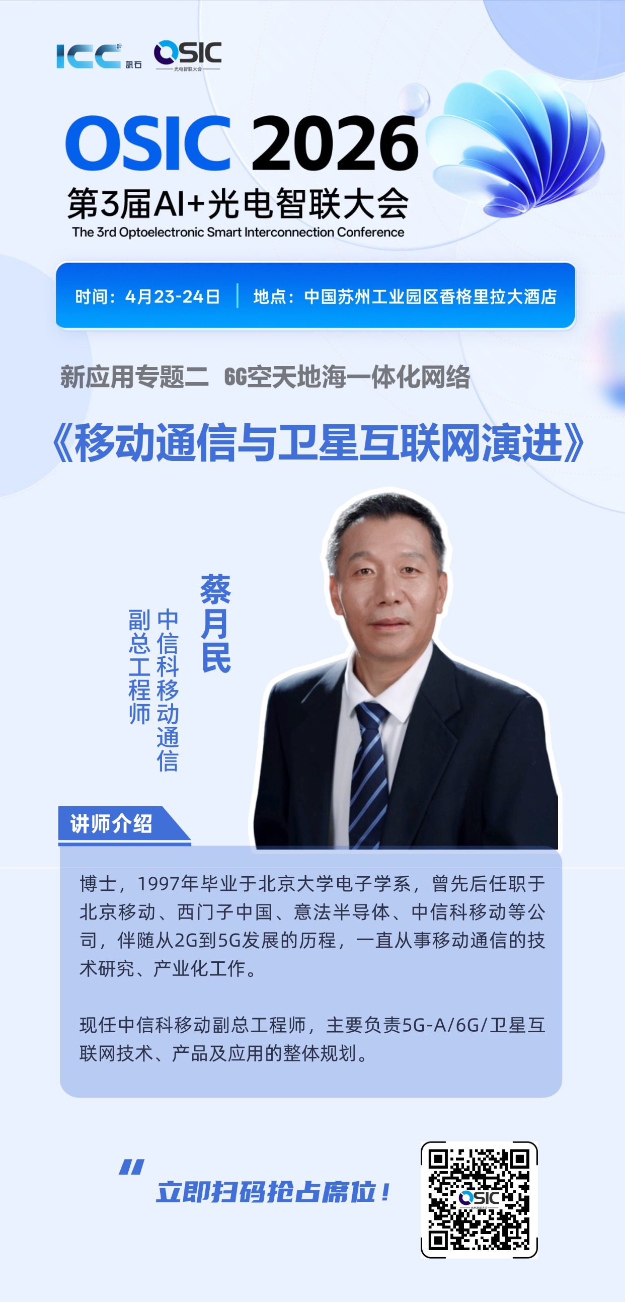 ICC訊 4 月 23–24 日 OSIC 2026 第3屆AI+光電智聯(lián)大會(huì)以“跨界融合?智聯(lián)未來”為主題,深挖OFC新趨勢(shì)、開拓光通信跨界新應(yīng)用,會(huì)議采用2(主論壇)+4(專題論壇)+N(閉門論壇、產(chǎn)品展、人才招聘展、休閑活動(dòng)等)會(huì)議模型,圍繞市場(chǎng)、技術(shù)、資本、人才四大維度展開,以AI算力光互聯(lián)為核心,延伸至6G空天地海一體化、車路云智能網(wǎng)聯(lián)、具身智能互聯(lián)等前沿領(lǐng)域與1500位與會(huì)嘉賓共同討論。