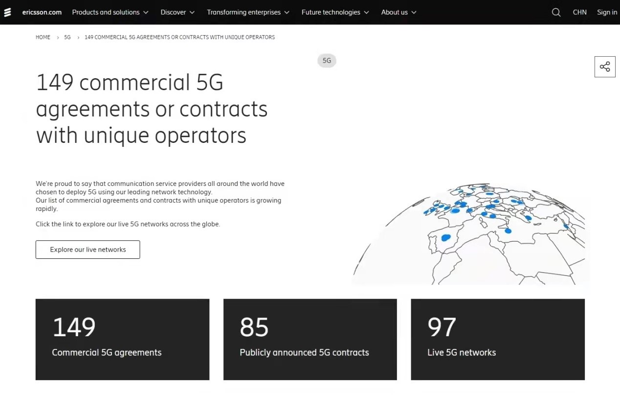 ICC訊 愛立信官網(wǎng)公布的數(shù)據(jù)顯示:截至目前,愛立信已經(jīng)在全球獲得149個(gè)5G商用合同,其中愛立信已經(jīng)與85家運(yùn)營(yíng)商客戶達(dá)成可公示的5G商用合同,目前在46個(gè)國(guó)家為97個(gè)已經(jīng)正式運(yùn)行的5G商用網(wǎng)絡(luò)提供設(shè)備。
