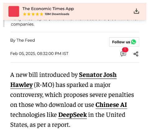霍利的法案提議禁止美國公司在中國研究人工智能或與中國公司合作。該法案還將禁止美國公司投資中國人工智能開發(fā)。然而,批評人士擔(dān)心,該法案的措辭過于寬泛,可能會導(dǎo)致意想不到的后果,例如將下載 DeepSeek 和類似的人工智能模型定為犯罪。