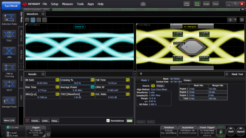 (2)下行50Gbps鏈路,經(jīng)過(guò)光模塊內(nèi)置高性能數(shù)字處理芯片,轉(zhuǎn)化為49.7664Gbps的NRZ信號(hào),采用高性能50GBaud EML激光驅(qū)動(dòng)器,驅(qū)動(dòng)海信自研EML+SOA激光器,發(fā)射光功率優(yōu)于+8.5dBm,發(fā)射光眼圖ER優(yōu)于7dB,TDEC小于2dB,滿足接入網(wǎng)20km傳輸?shù)男枨?,鏈路預(yù)算覆蓋最新的N1和C+功率檔;