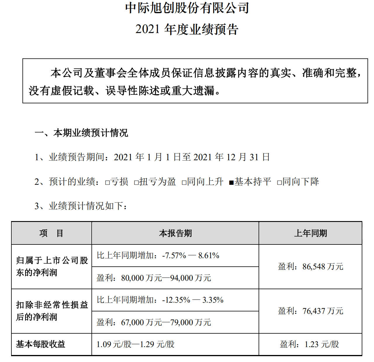 ICC訊 1月27日,中際旭創(chuàng)股份有限公司(簡稱中際旭創(chuàng))發(fā)布2021年度業(yè)績預告,報告期內(nèi)預計業(yè)績基本持平,歸屬上市公司股東的凈利潤同比增長-7.57%-8.61%,上年同期凈利潤為86,548萬元。