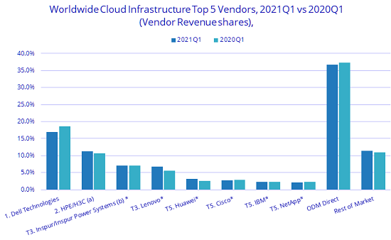 在供應(yīng)商層面,2021年第一季度,所有主要供應(yīng)商的云基礎(chǔ)設(shè)施收入都實現(xiàn)增長,其中增長率最高的是聯(lián)想(38.2%)和華為(37.9%)。與去年第一季度相比,華為、聯(lián)想和HPE/H3C的市場份額均有所增長。