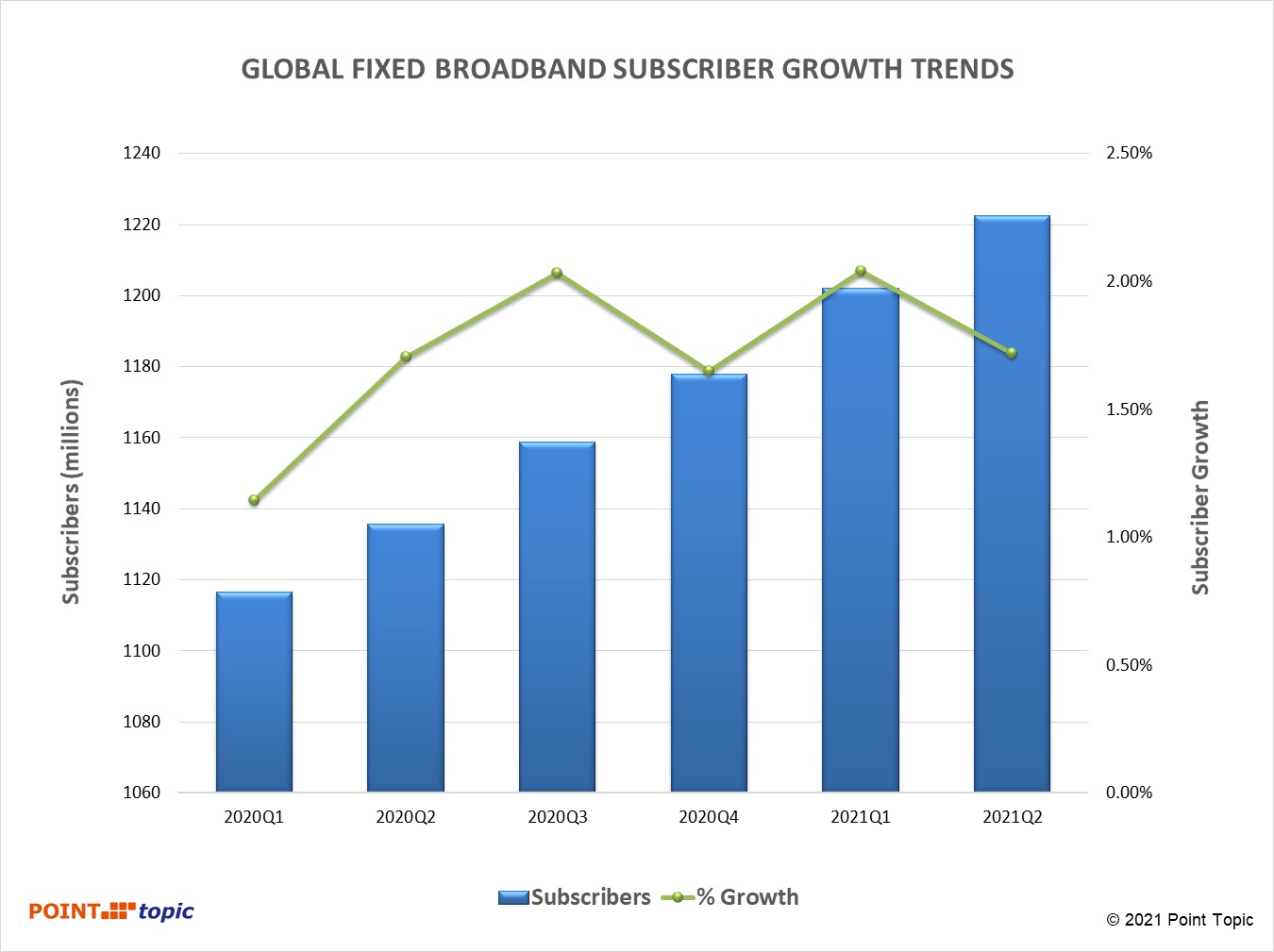 Figure 2. Global broadband subscribers and quarterly growth rates. Source – Point Topic.